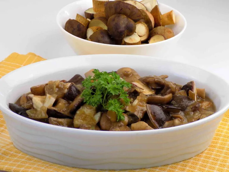 - Grzyby można podawać z makaronem, ziemniakami lub pieczywem.